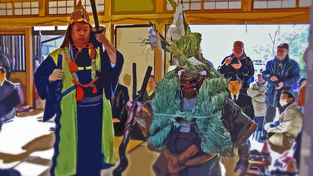 | この画像は初めて強飯式の行事を見たときのものです。毎年1月3日に鹿沼市上粕尾発光路地区で行われる、強飯式行事です。 国指定重要無形民俗文化財・・・ ここからは鹿沼市のHPを参考にします。 正月三日、発光路にある鎮守妙見神社の祭り当番引き継ぎの後で行われる強力行事です。山伏と強力が登場して、祭りの代表者や客に高盛飯を強います。日光責めの流れをくむ古典的な強飯行事で、延文年間(1356〜1361年)から行われているといわれています。強飯行事とは、時をきめて人間界を訪れる神仏に人々が心をこめたごちそうを出して、もてなす儀礼で、飯や芋、酒などを大量に受け、人に責めるので強飯と呼ばれています。発光路の強力は、日光輪王寺のものと軌を一つにする日光修験の名残りを残すもので、地域の平和を祈念するものです。 ・・・1月3日開催ということである程度は覚悟していましたが、やはり雪がありました。行事を始めるにあたって演者の方々が当地区にある妙見神社にお参りをし、神事を終了後、発光路公民館に移動し、本来の強飯式の行事を行います。鹿沼市長はじめとするいろいろな役職の方々が当行事に参加され、現在地区住民が感じていること、困っていることを聞くような行事です。・・・ |